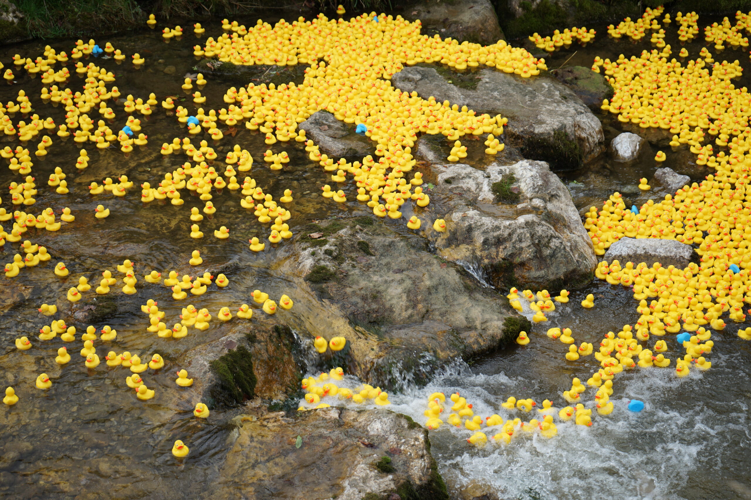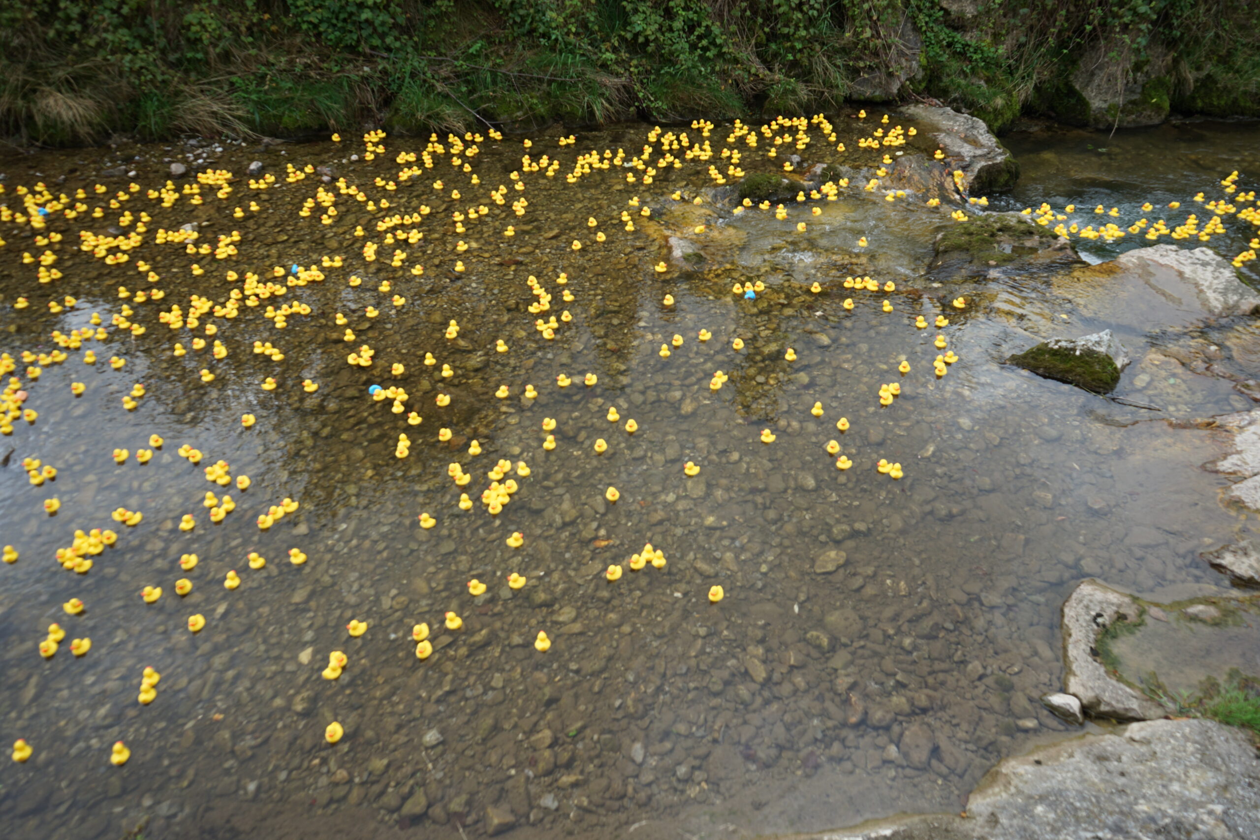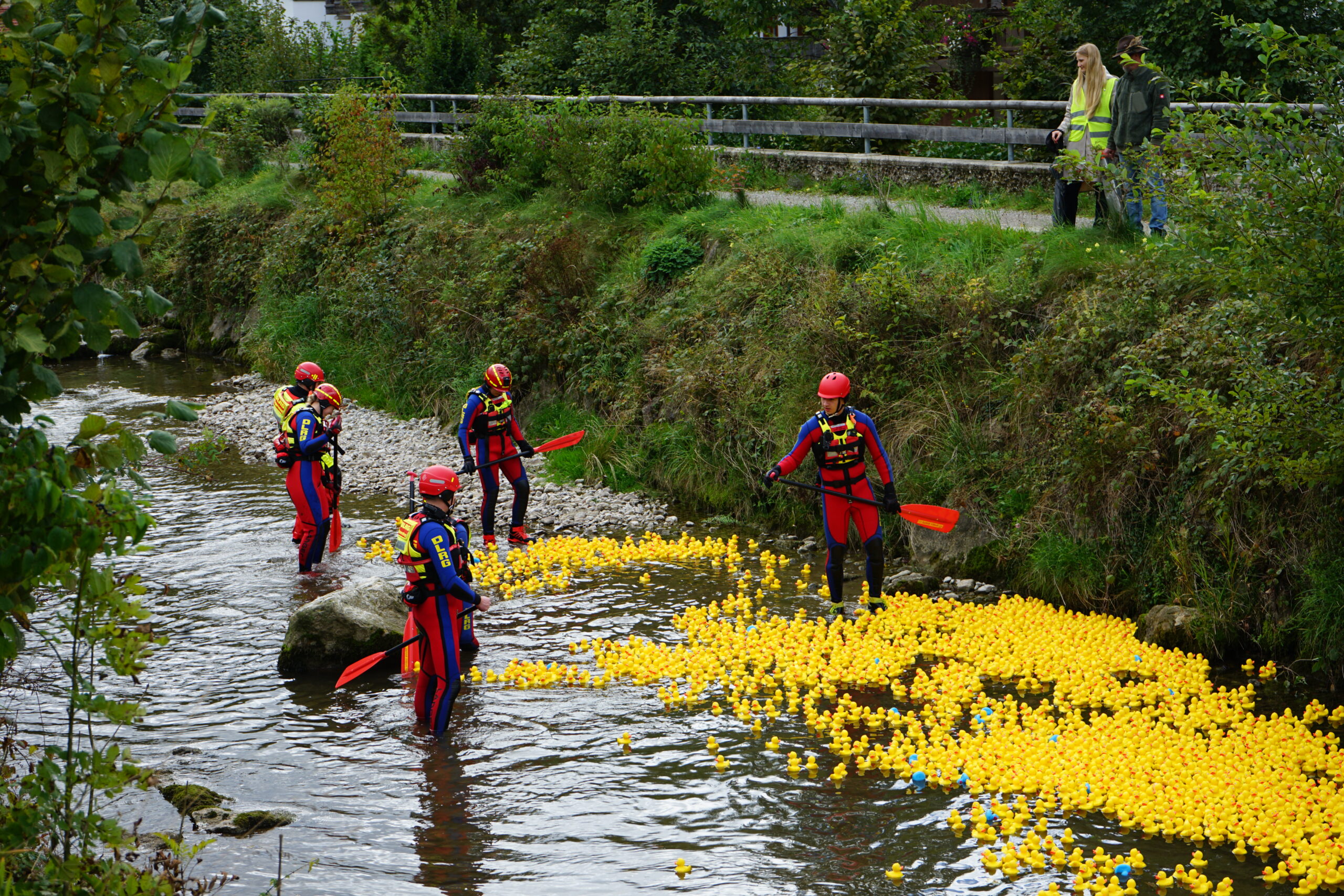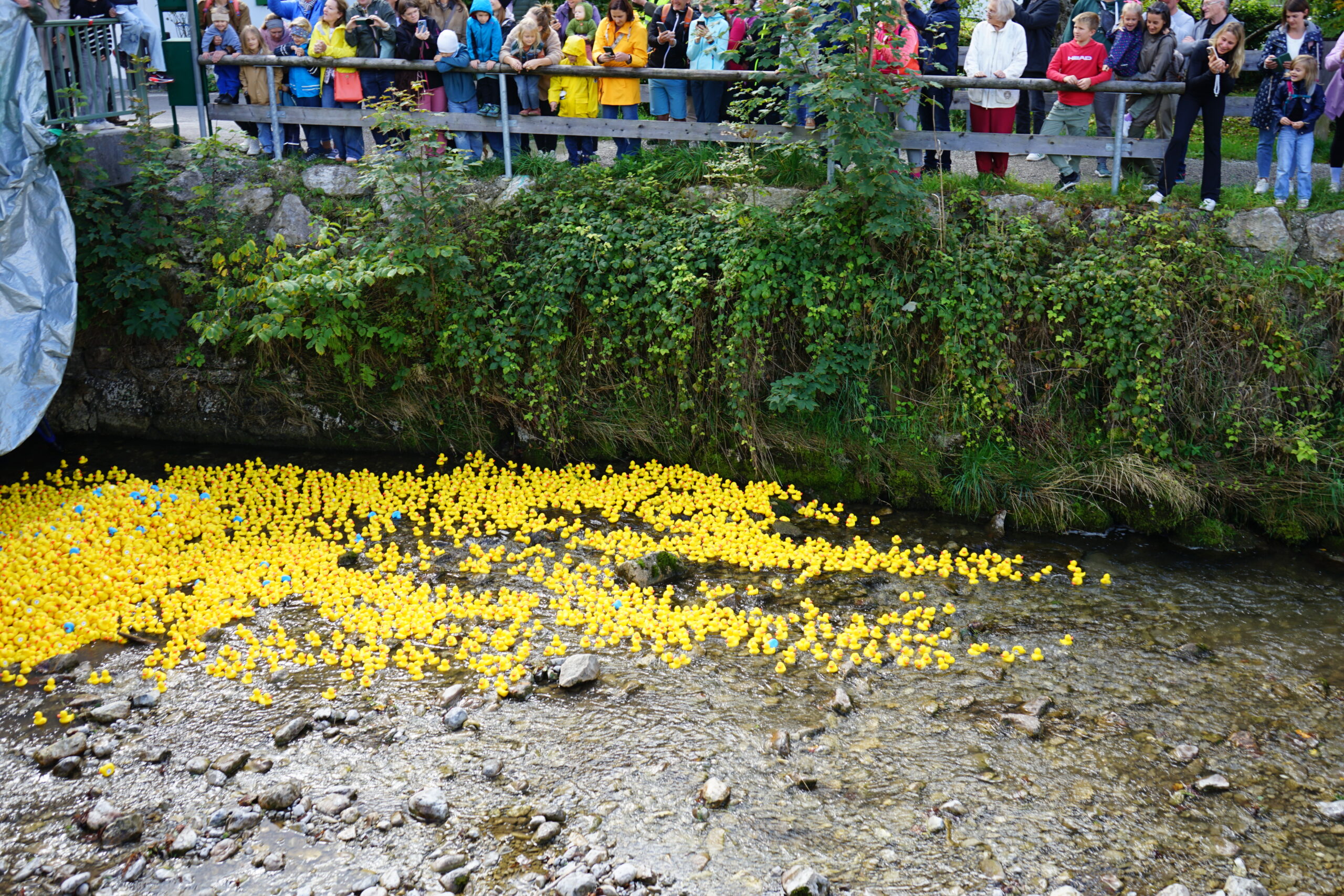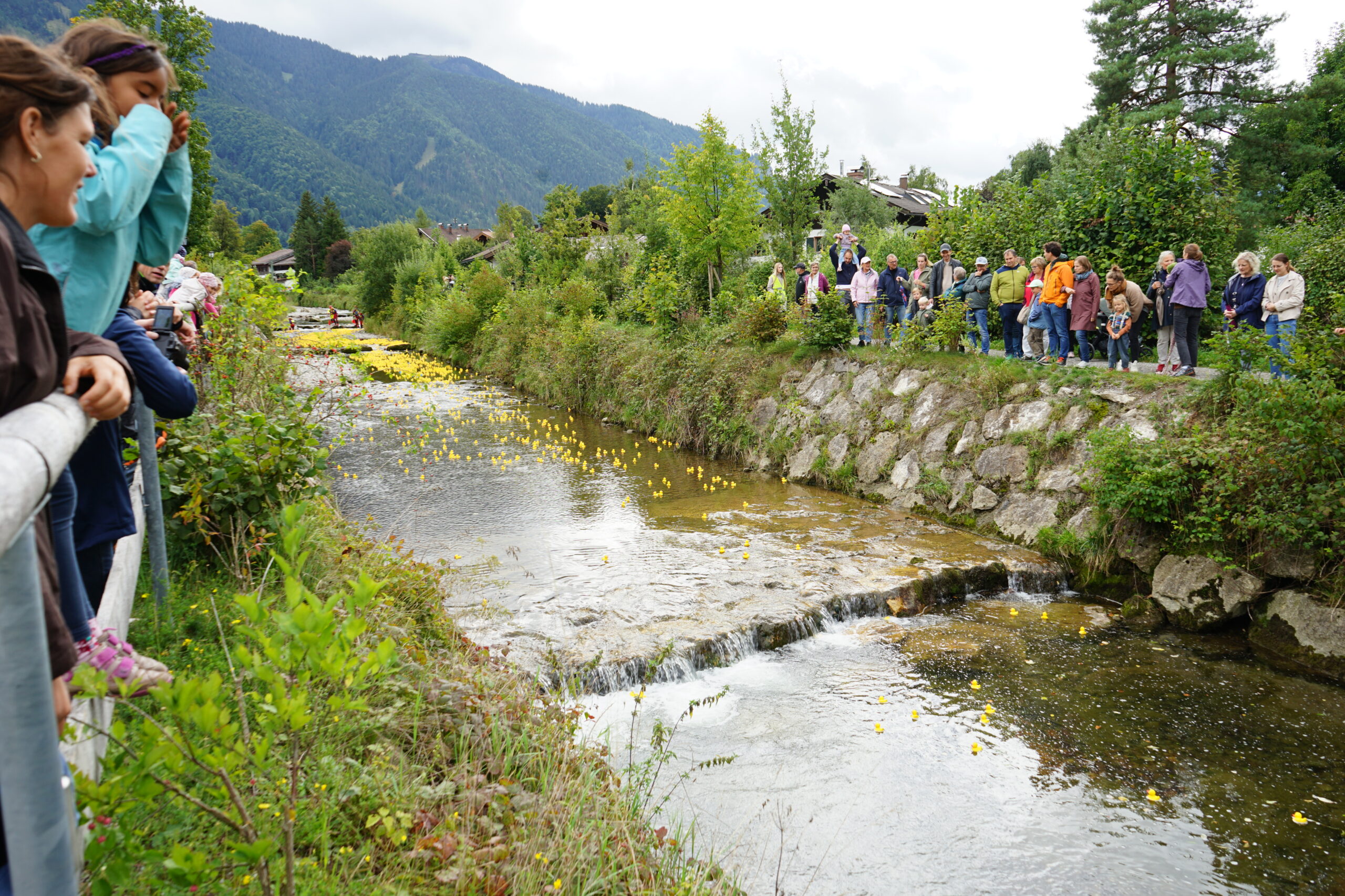Die Gummienten werden von der BrĂŒcke aus zu Wasser gelassen und treiben rund 300âŻMeter durch die Rottach bis ins Ziel.